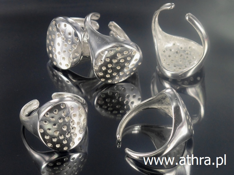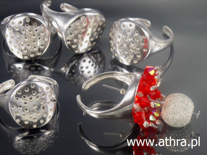Elementy z mosiądzu posrebrzane, baza pierścionka, otwory w talerzyku można wykorzystać do przymocowania szpilką lub kółeczkiem kamieni lub kryształków Swarovskiego. Zapraszamy do zakupów online na www.athra.pl