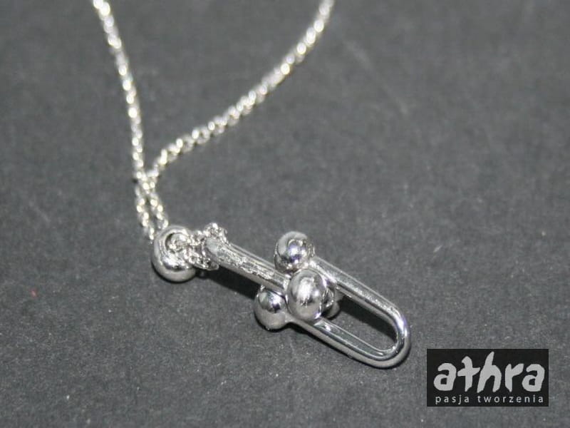 Półfabrykat srebrny, próba Ag 925. Kolia rodowana regulowana z supłem na środku.